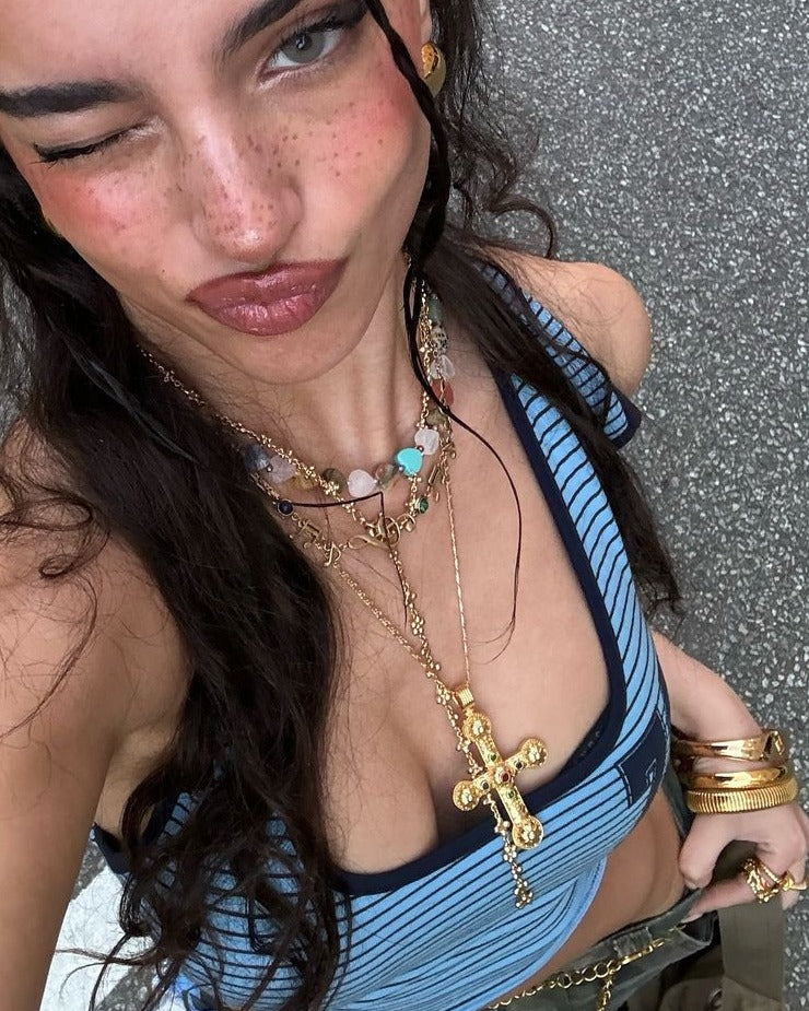 Step into the realm of reinterpreted “Regency” with this unique and contemporary necklace – A harmonious blend of ornate and edgy, street-inspired style, the daisy inspired charm and cross pendant commands attention and elevates any streetwear moment to a work of fashion and art.